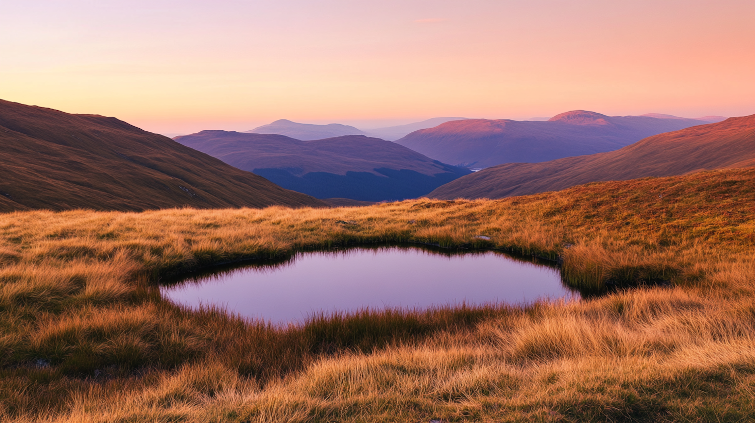 Tranquil pond surrounded by golden grass, reflecting a pink-orange sky with distant hills and mountains in a serene landscape.