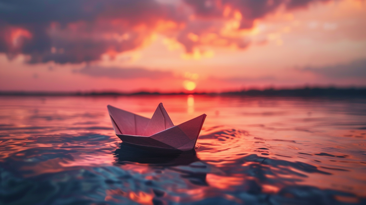 A paper boat floats on a calm sea during a vibrant sunset, reflecting pink and orange hues in a tranquil scene.