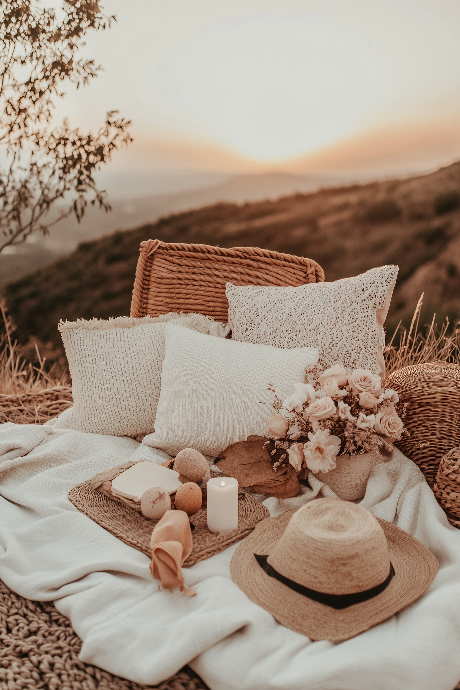 Cozy picnic setup with pillows, straw hat, flowers, and candle on a hill at sunset. Soft neutral tones create a serene atmosphere.