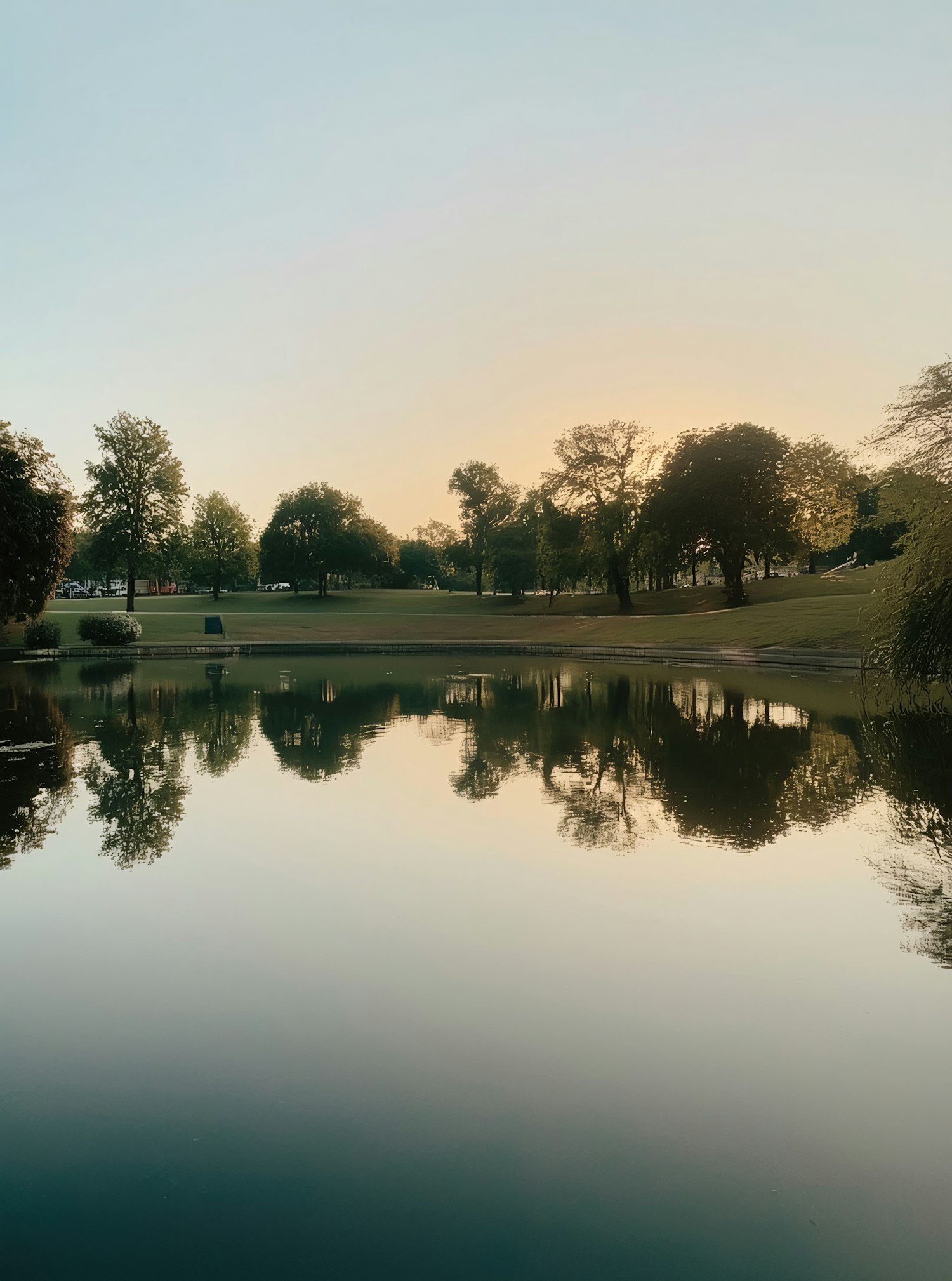 A tranquil pond reflects trees and a soft sunset, creating a serene and picturesque park landscape.