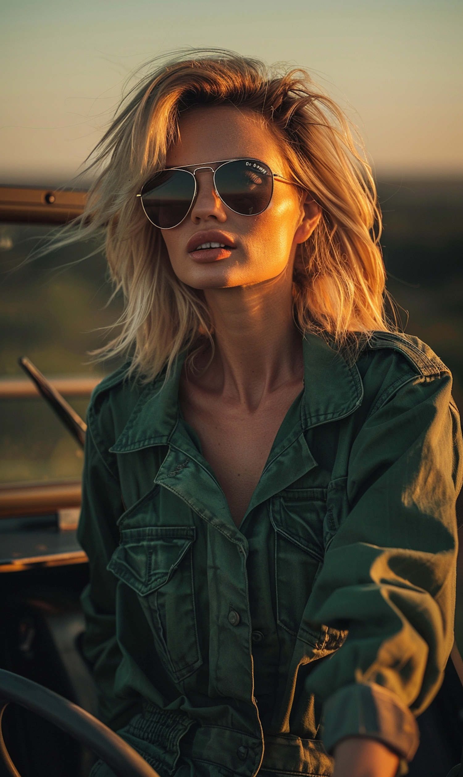 Blonde woman in aviator sunglasses and green jacket, bathed in golden sunlight, exudes adventure and freedom in an open vehicle.