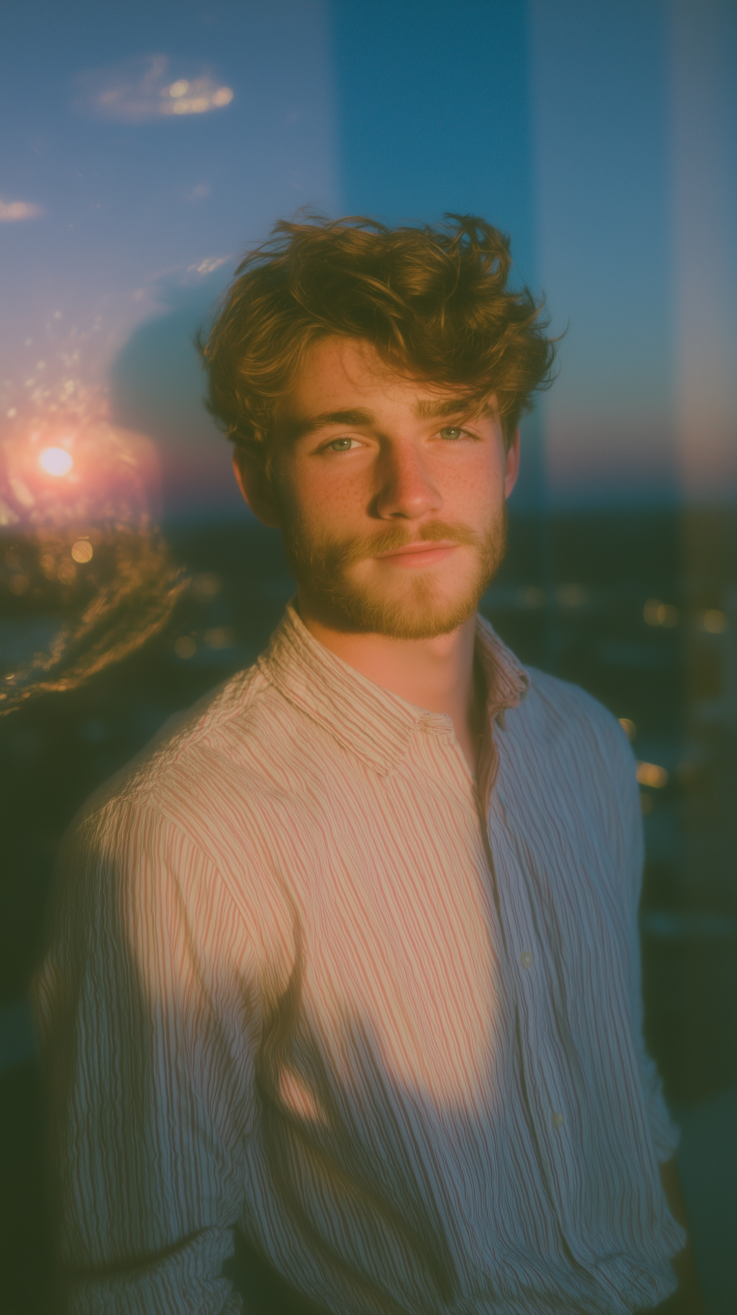 A young man with wavy hair and a beard, standing in warm sunset lighting, wearing a striped shirt with a serene background.