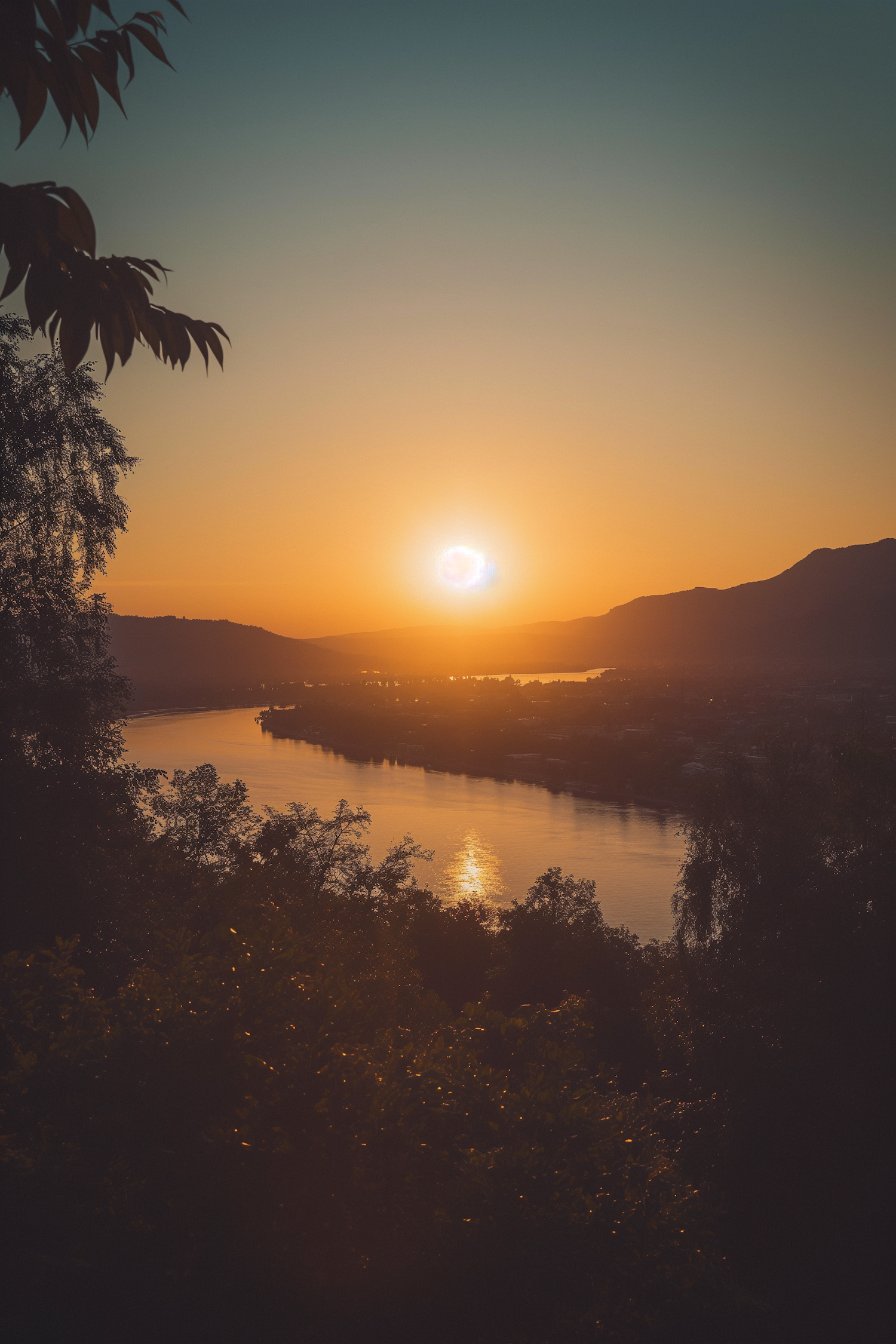 Golden sunset over a tranquil river, with silhouetted trees and distant hills, creating a serene and picturesque landscape.