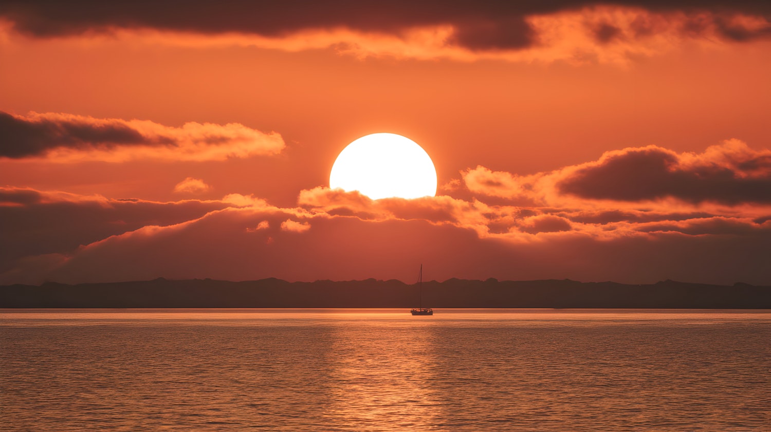 A breathtaking sunset with a glowing sun, calm waters, and a silhouetted sailboat on the horizon. Perfect for serene and scenic vibes.