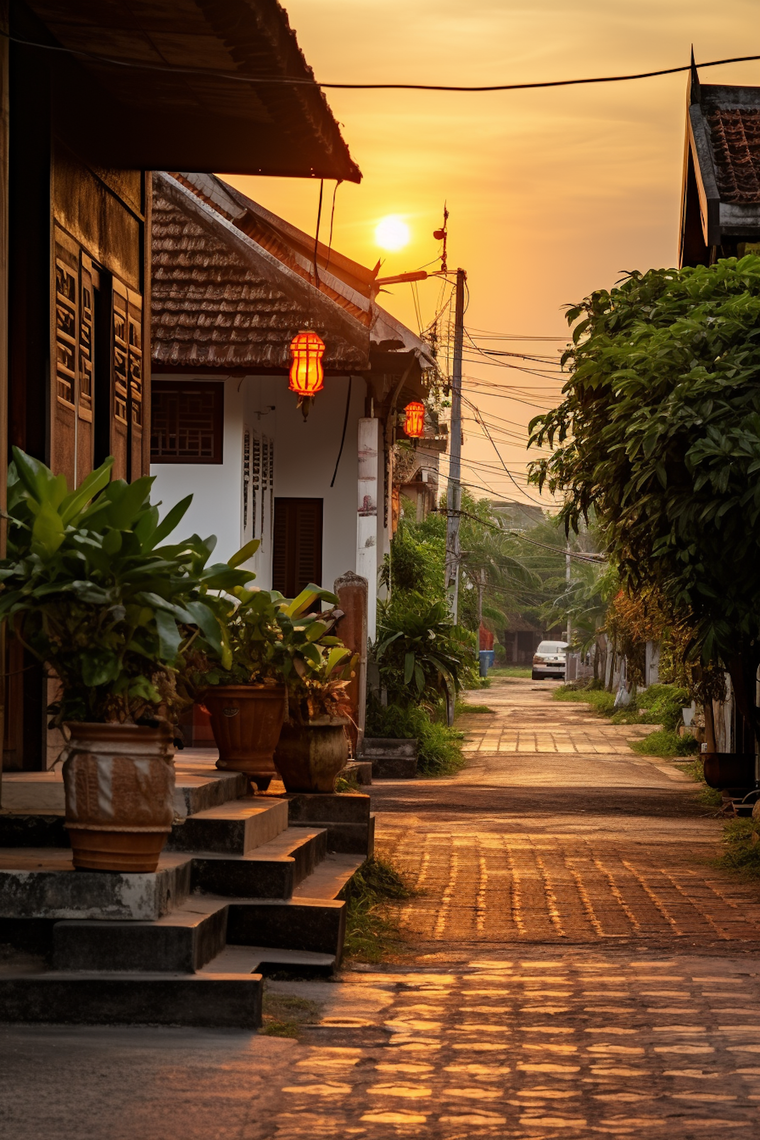 Charming sunset street scene with red lanterns, cobblestone path, and lush greenery. Traditional houses create a serene atmosphere.