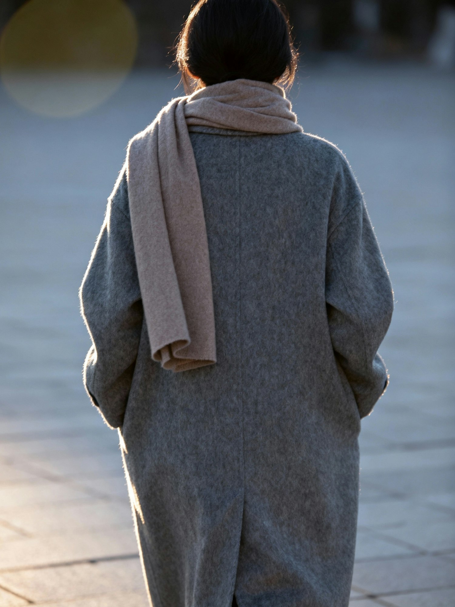 A person in a gray coat and beige scarf stands outdoors, backlit by warm sunlight, creating a peaceful and serene scene.