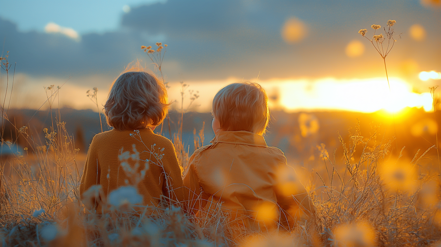 Two children sitting in a golden field at sunset, surrounded by wildflowers and bathed in warm, dreamy sunlight.