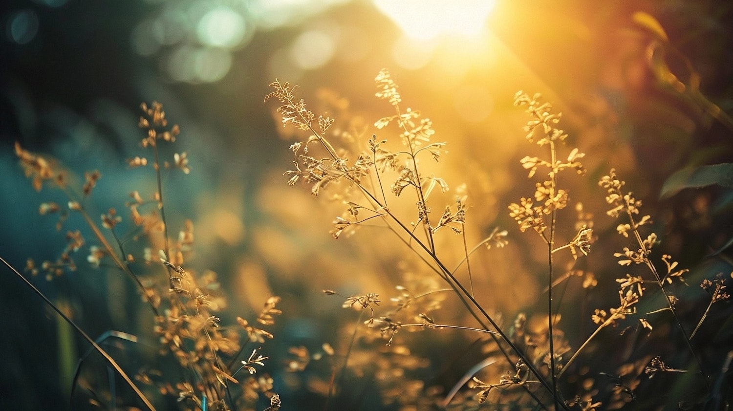 Golden grass stems bathed in warm sunlight with a dreamy bokeh background, evoking serenity and natural beauty.