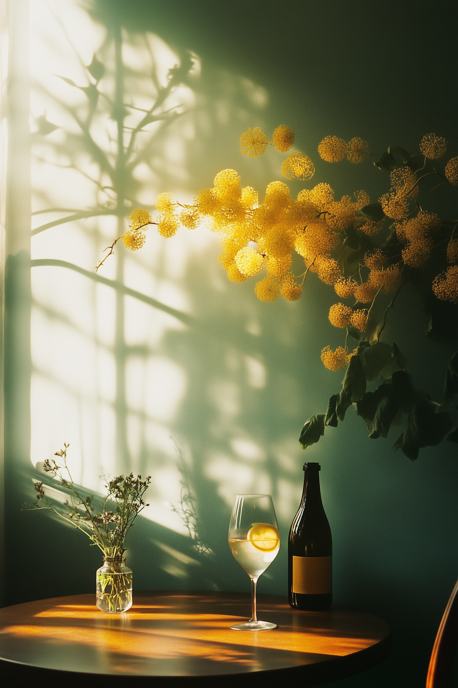 Sunlit table with a wine glass, mimosa flowers, and a bottle, creating a cozy and artistic vibe with warm tones and soft shadows.