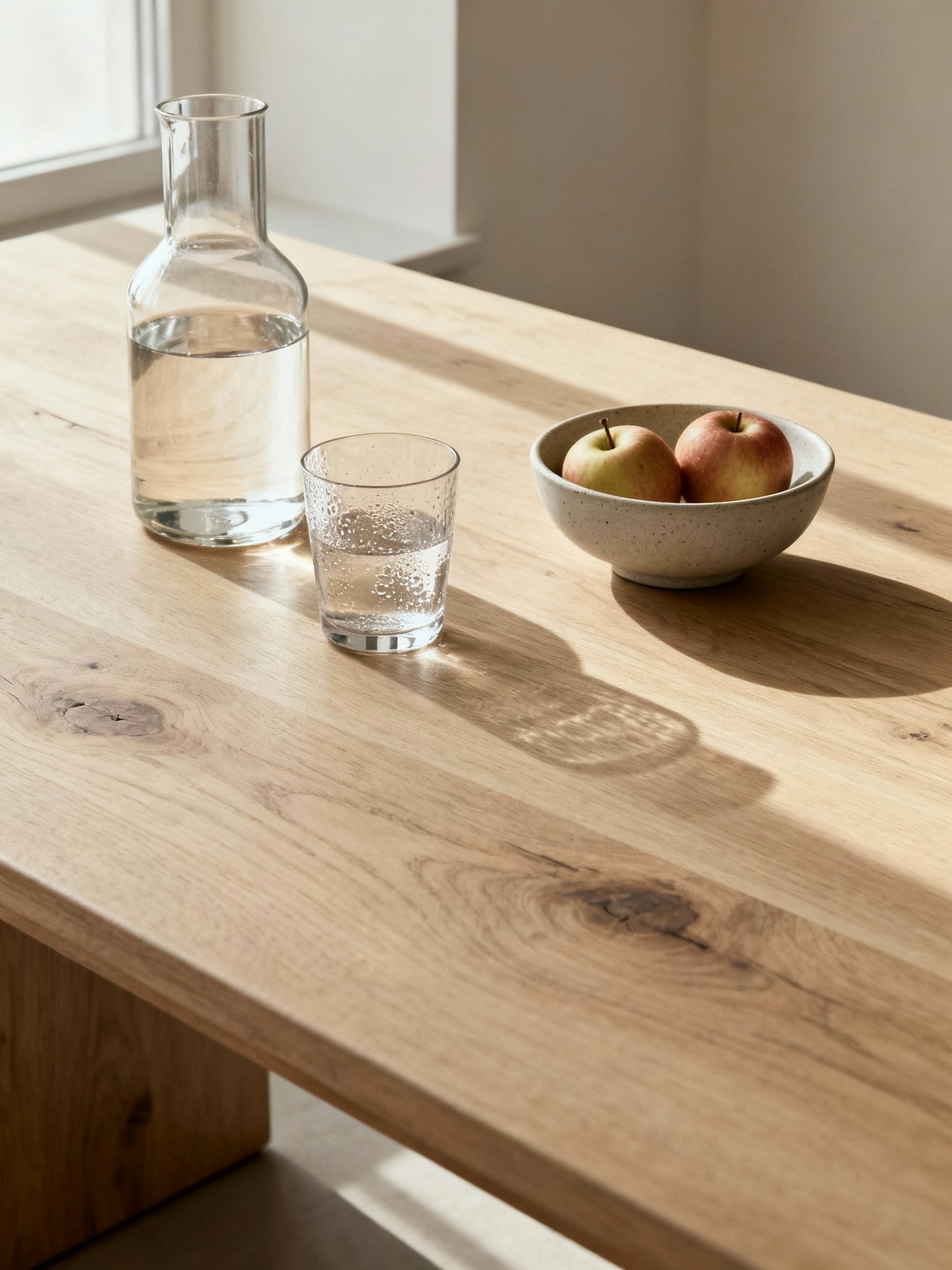A minimalist wooden table with a water carafe, glass, and a bowl of apples, bathed in soft natural light from a nearby window.