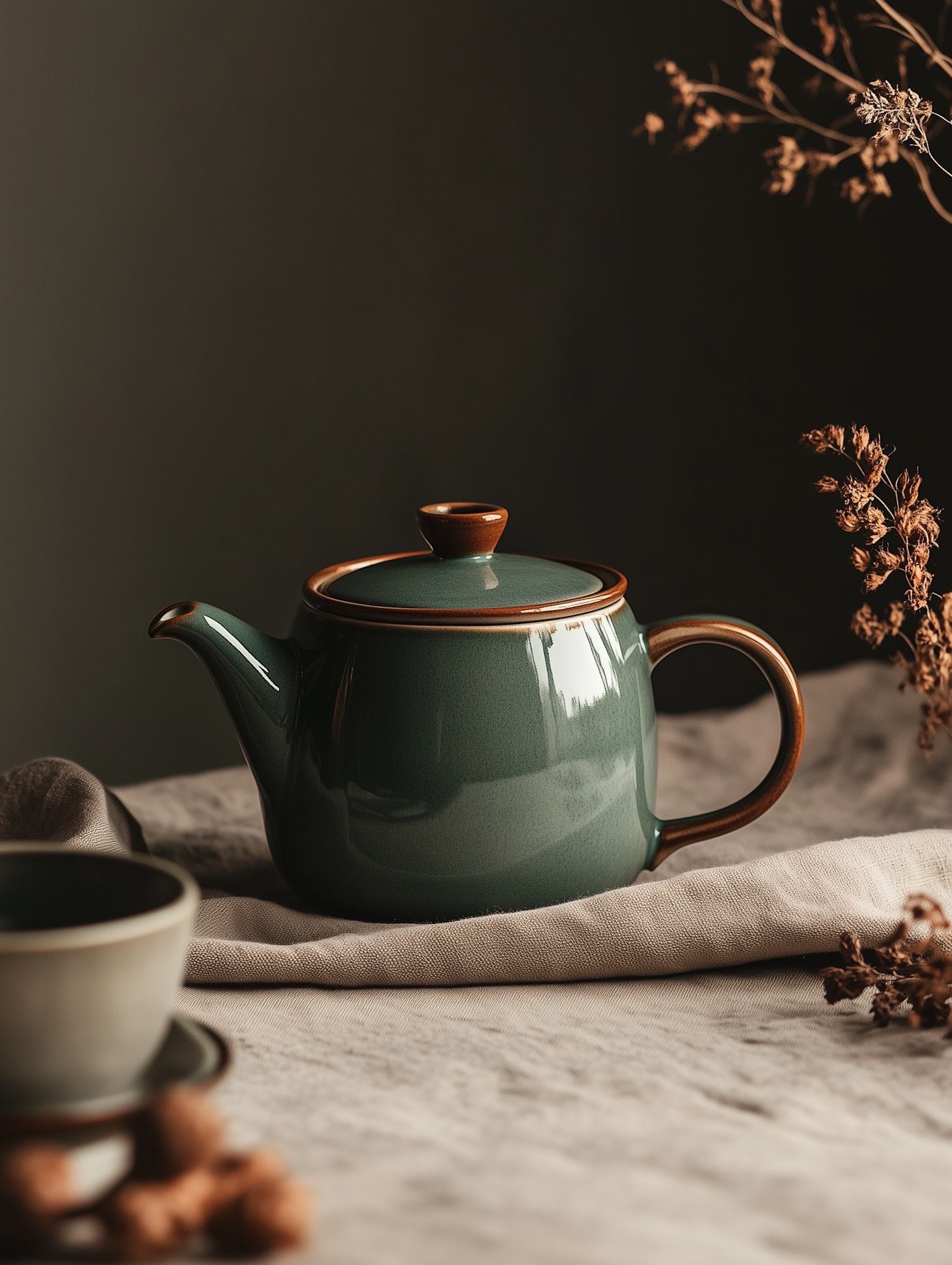 Elegant green ceramic teapot with brown accents on a beige cloth, paired with a teacup and dried twigs for a rustic, cozy vibe.