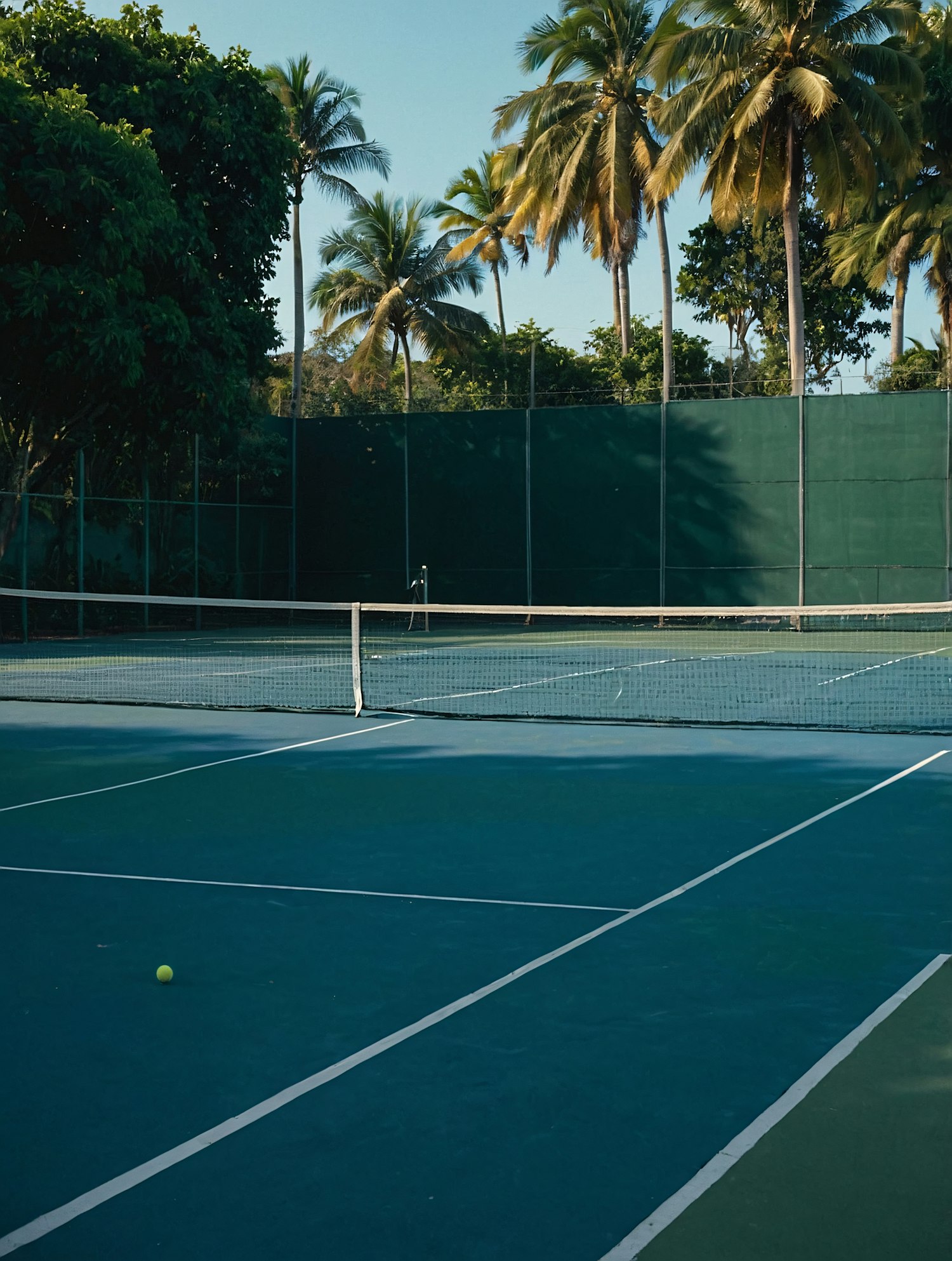 A peaceful tennis court with a green-blue surface, surrounded by palm trees and greenery, under a clear sky. A tennis ball lies on the court.