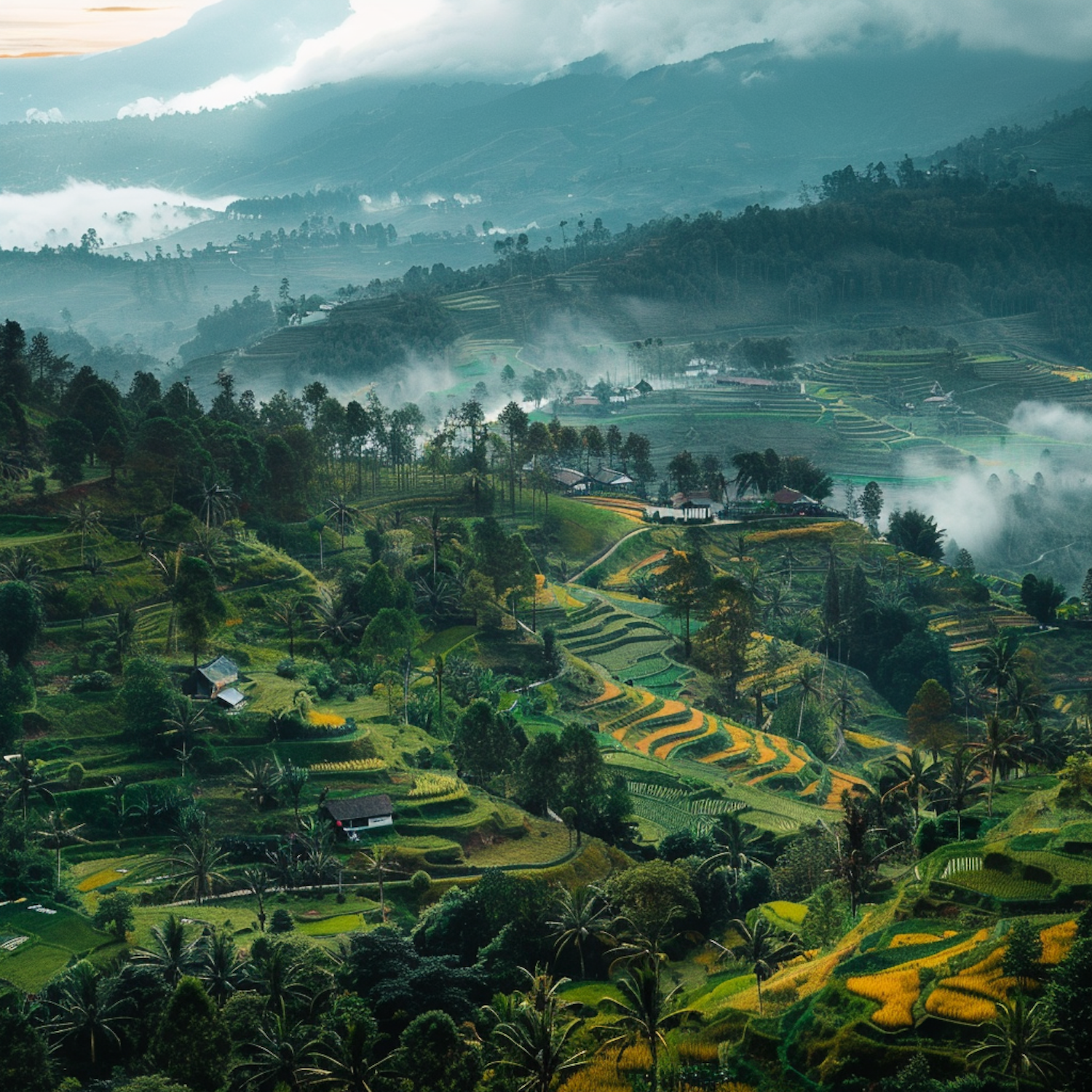 Stunning terraced rice fields with lush greenery and golden hues, set against misty hills and distant mountains.