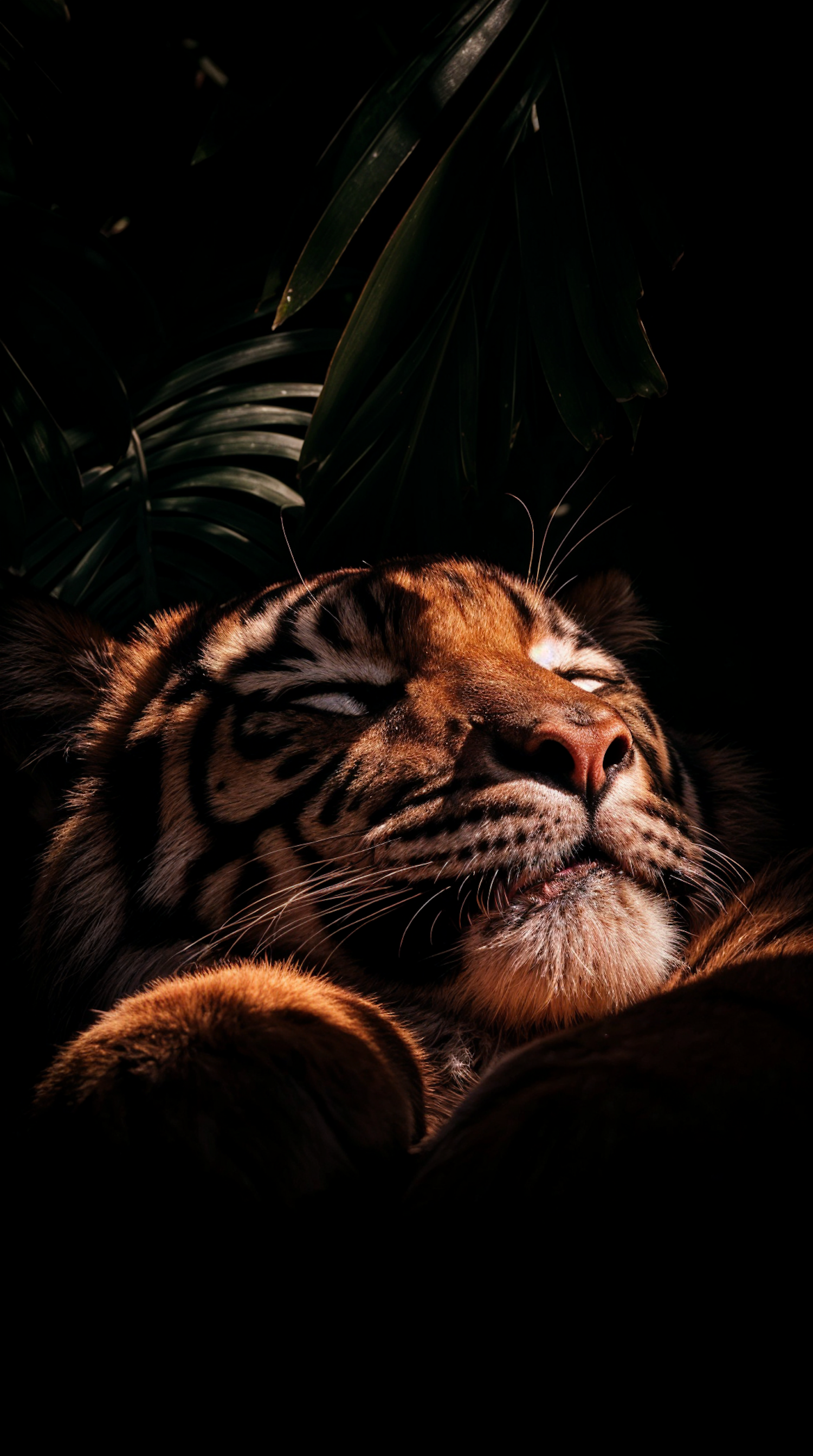 A serene tiger rests in dappled light, surrounded by lush leaves, highlighting its striking orange and black fur.