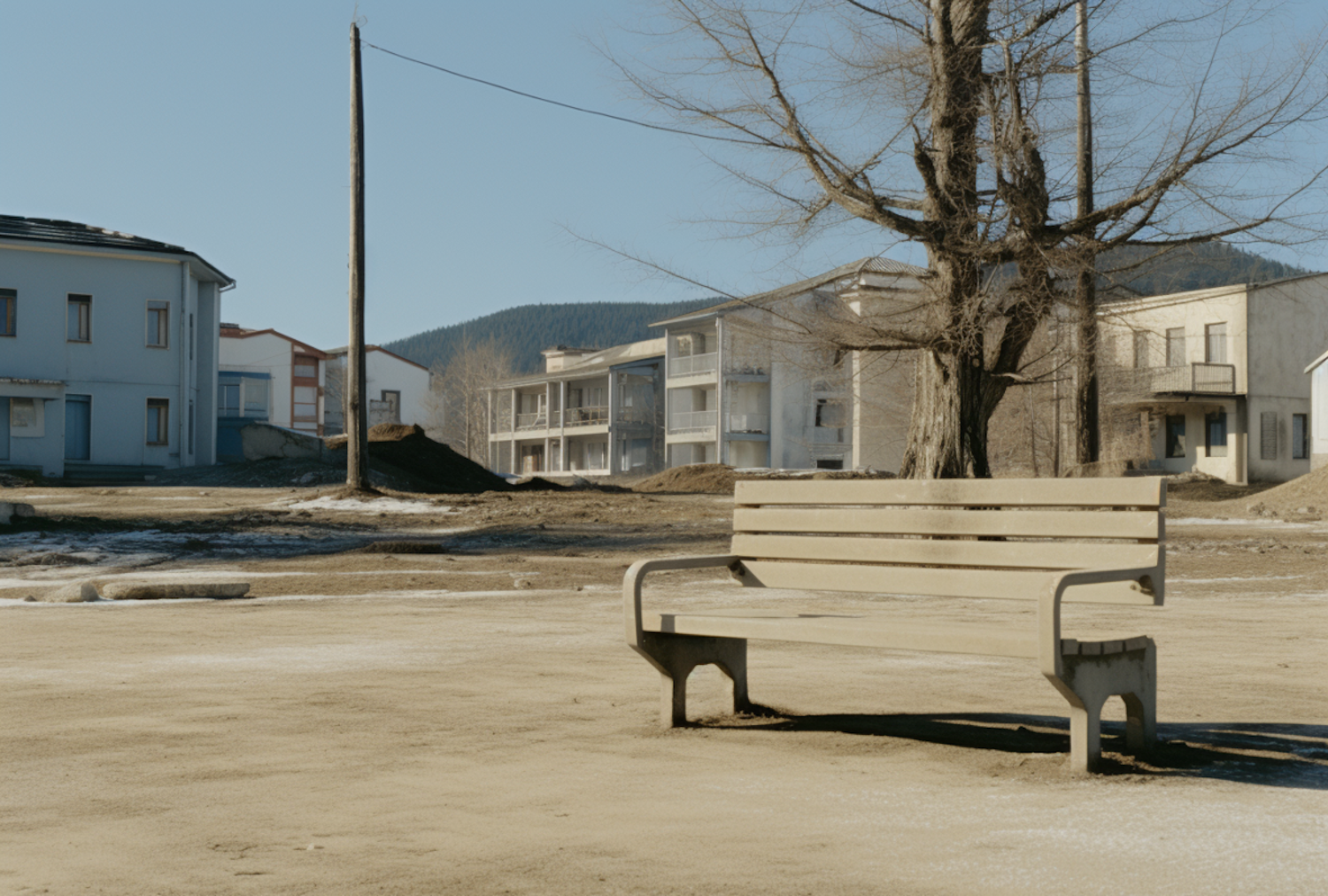 Empty bench in a quiet, desolate area with leafless trees and worn buildings under a clear blue sky.