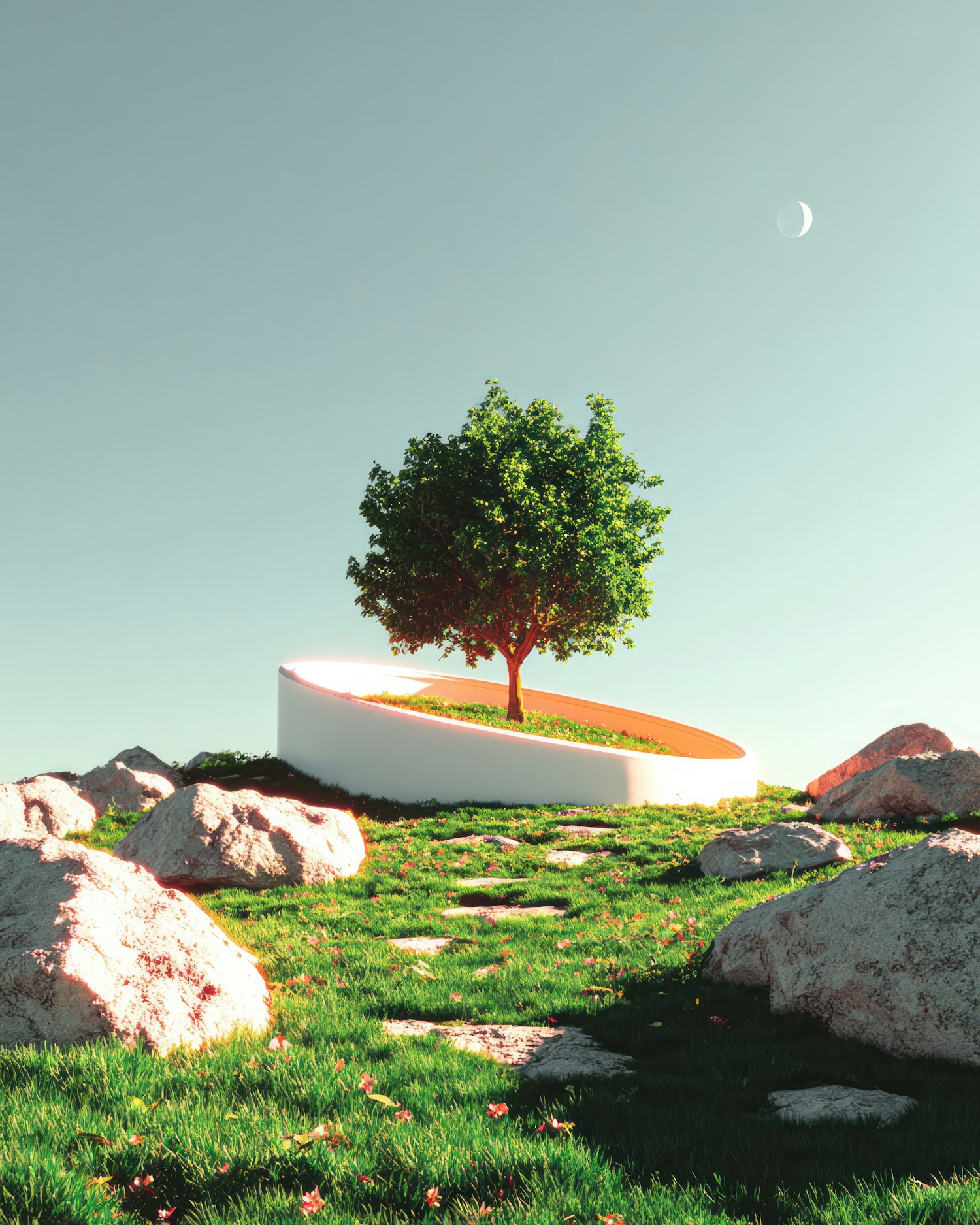 A peaceful scene of a tree encircled by a modern structure on a grassy hill, with rocks and a crescent moon in the background.