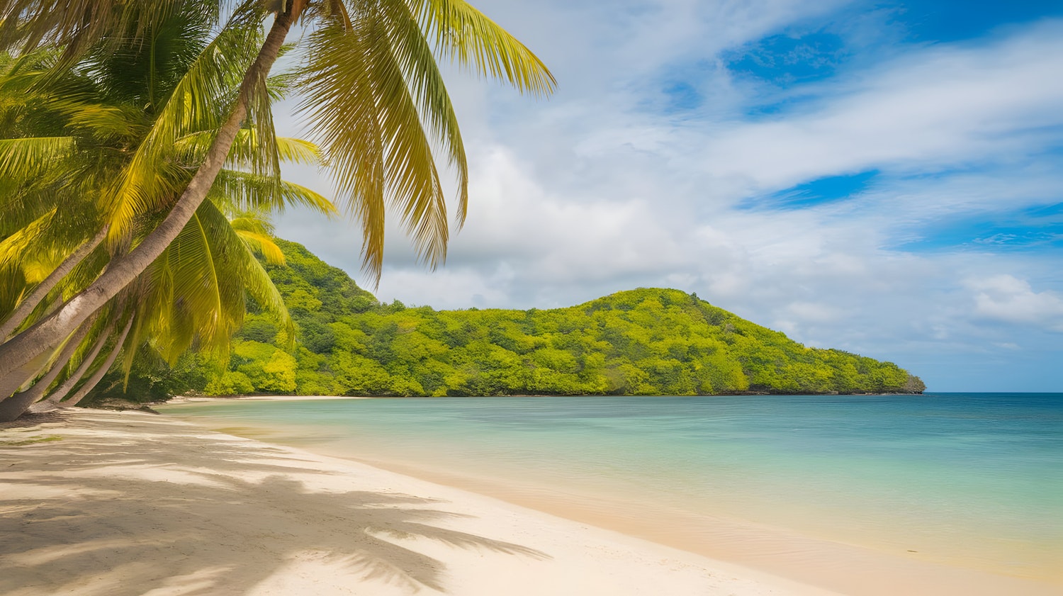 Idyllic tropical beach with white sand, leaning palm trees, turquoise water, and lush green hills under a partly cloudy blue sky.
