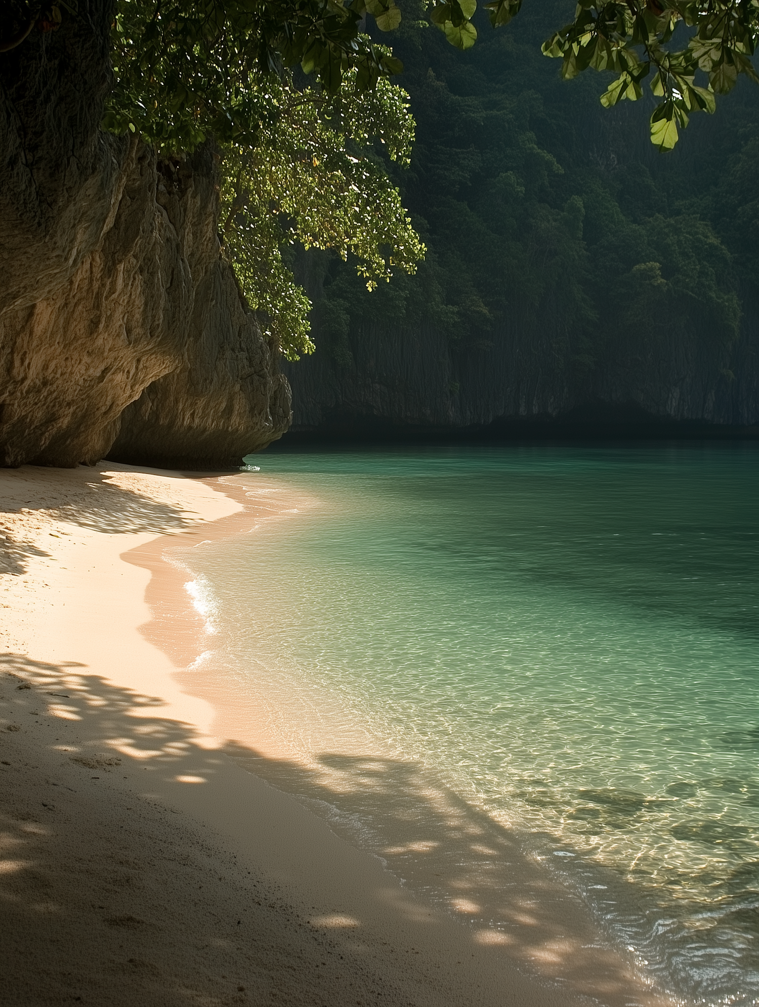 Tranquil tropical beach with golden sand, turquoise water, and lush greenery. Perfect for a serene escape or nature-inspired relaxation.