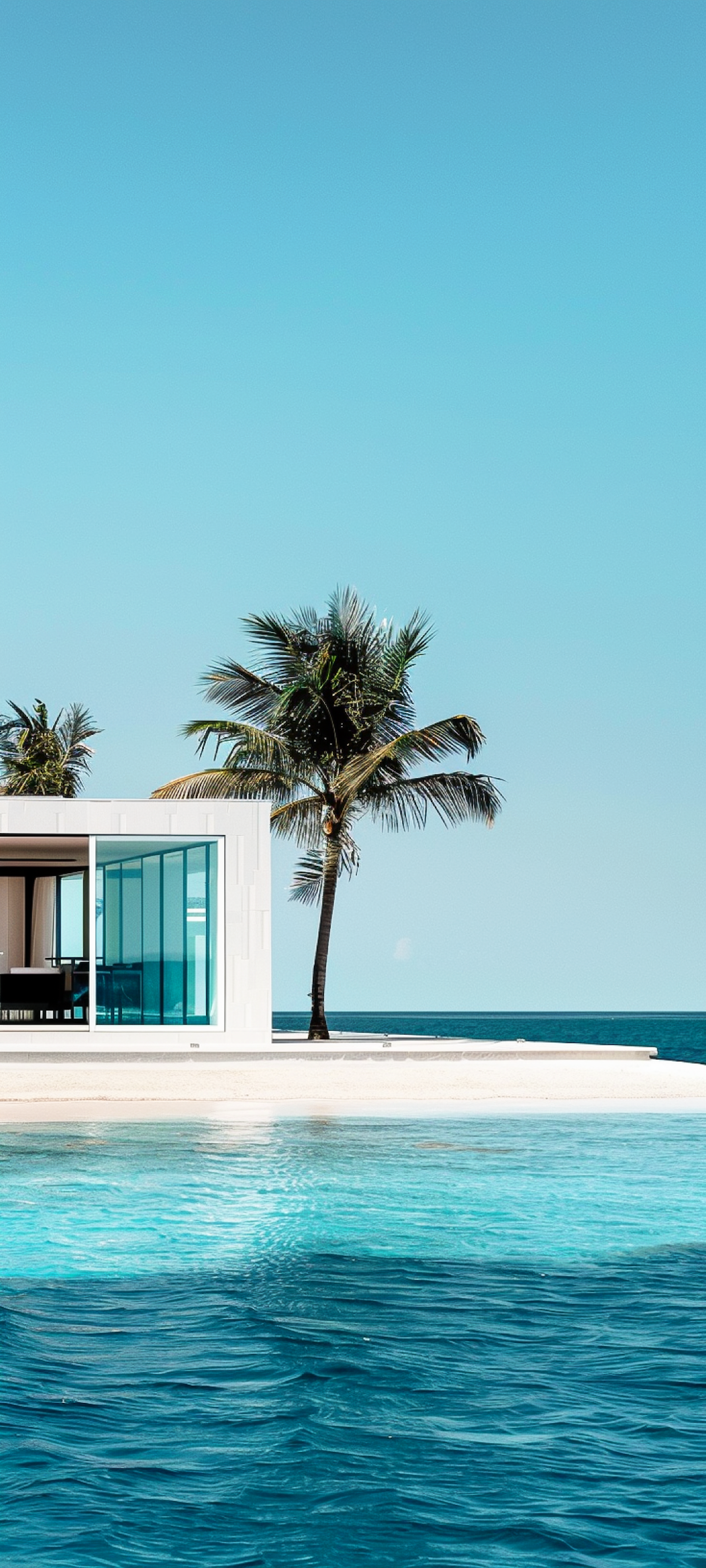 Modern white building with glass windows by a turquoise ocean and palm trees under a clear blue sky.