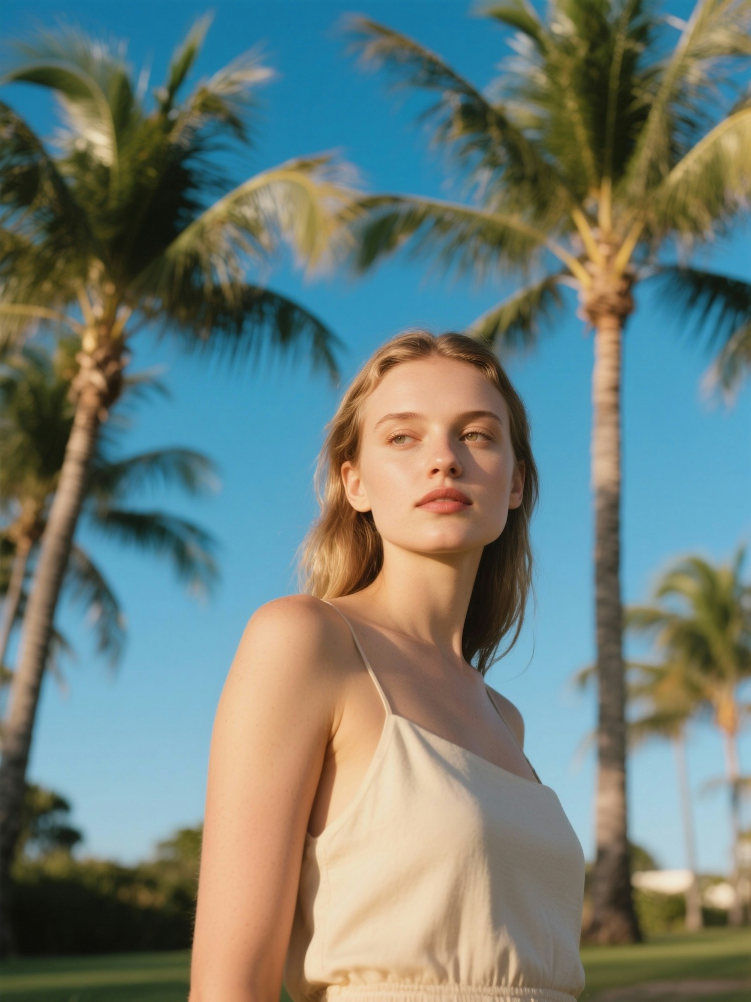 A serene portrait of a young woman outdoors with palm trees and a clear blue sky in the background, evoking a tropical vibe.