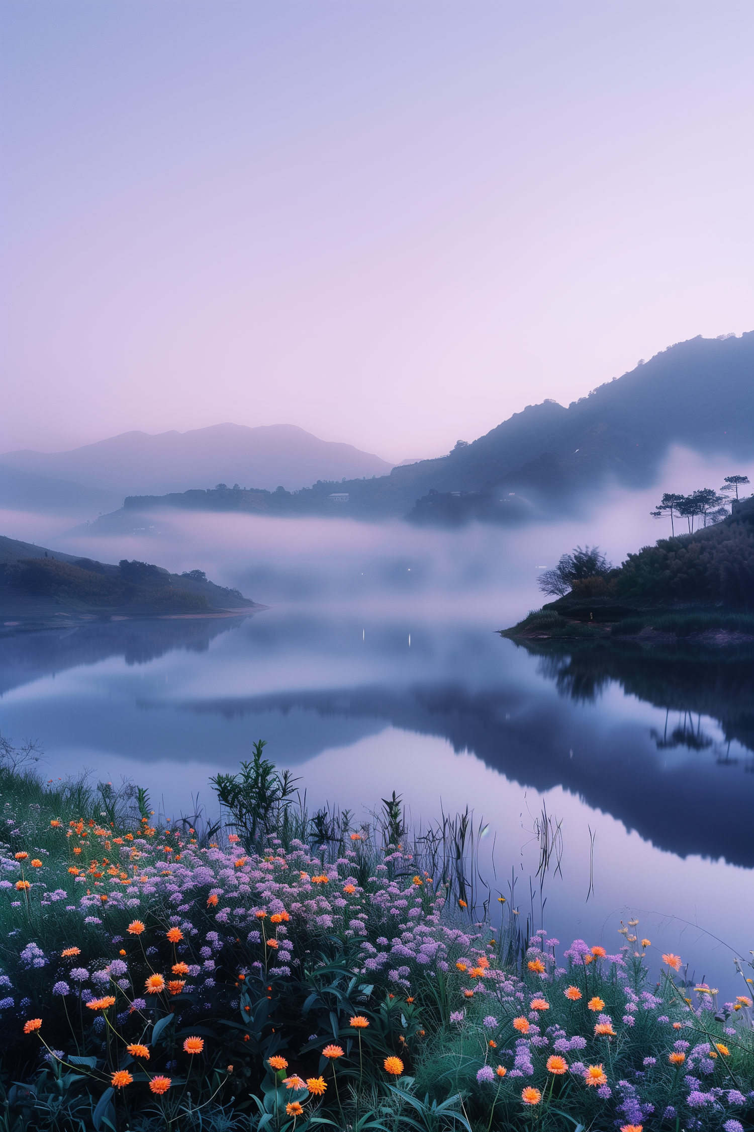 Tranquil lake with misty hills and vibrant wildflowers in twilight, reflecting serene hues and creating a dreamlike atmosphere.
