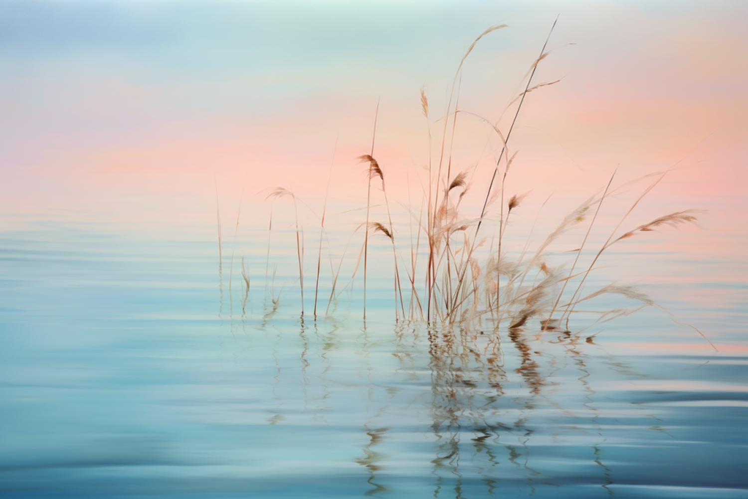 Serene scene of reeds in calm water with pastel pink and blue hues, creating a tranquil and minimalist atmosphere.