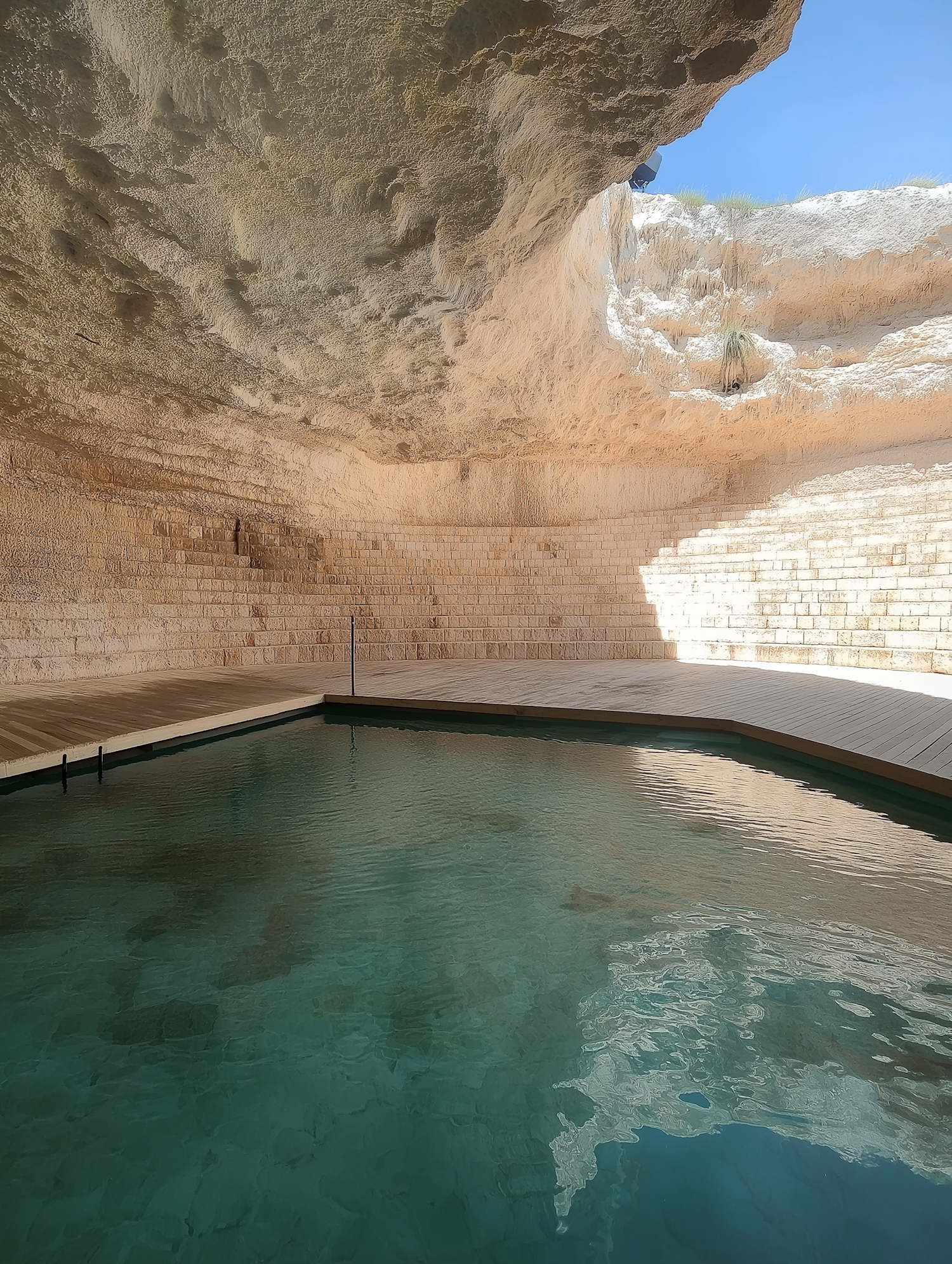 A tranquil underground pool with turquoise water, stone walls, and a wooden deck, illuminated by sunlight streaming through a cave opening.
