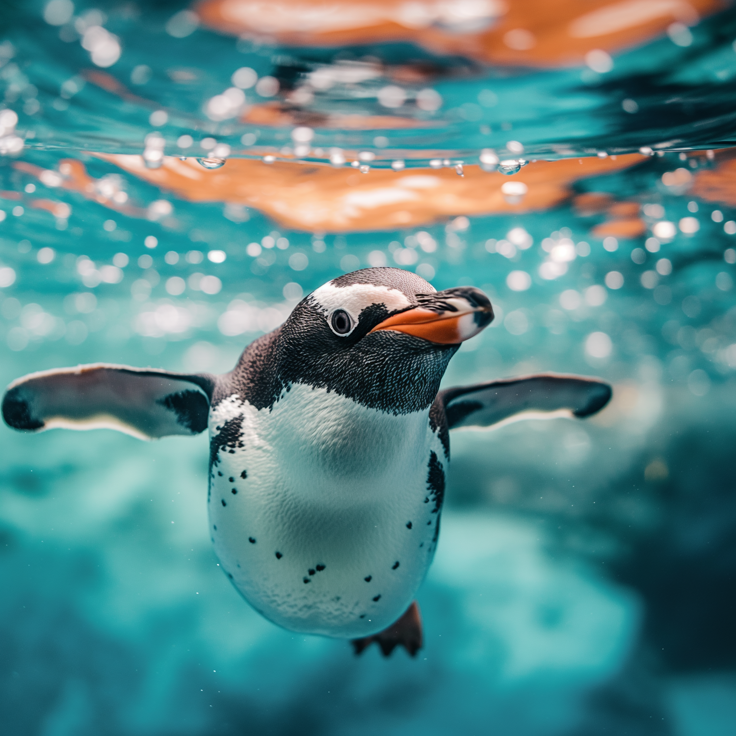 A penguin swims underwater with outstretched wings, surrounded by vibrant turquoise water and shimmering light patterns.