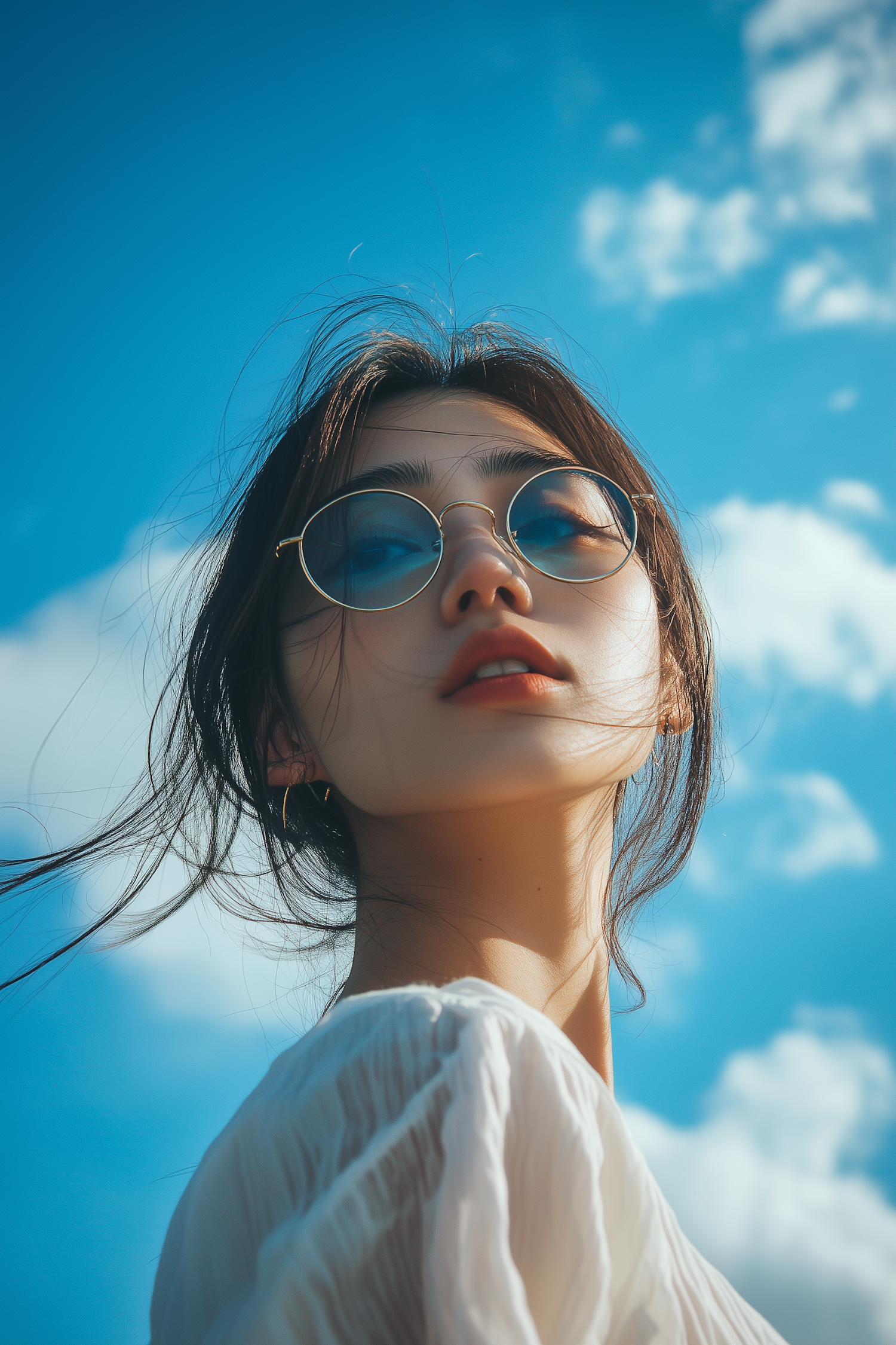 Asian woman with sunglasses gazing at the sky, wearing a white top against a bright blue sky with clouds.