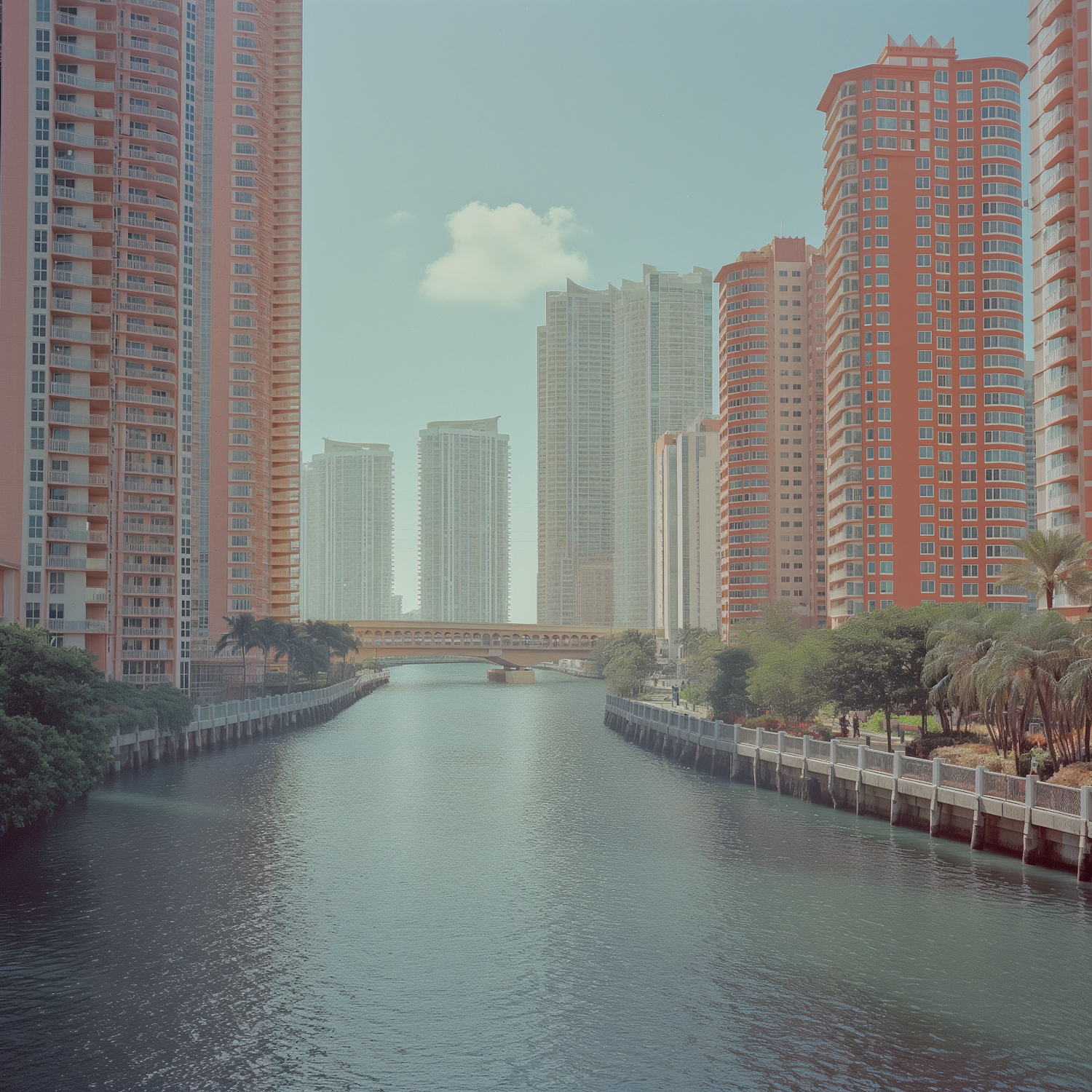 Tranquil river scene with modern skyscrapers and a bridge, framed by lush greenery and a clear sky.