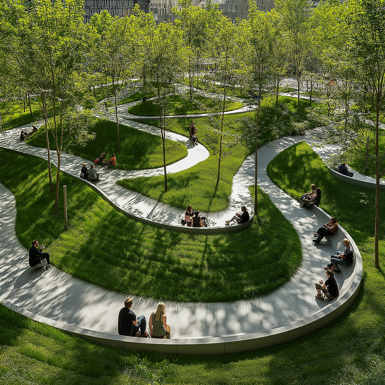 A modern park with winding paths, lush greenery, and people relaxing under dappled sunlight. Perfect blend of urban design and nature.
