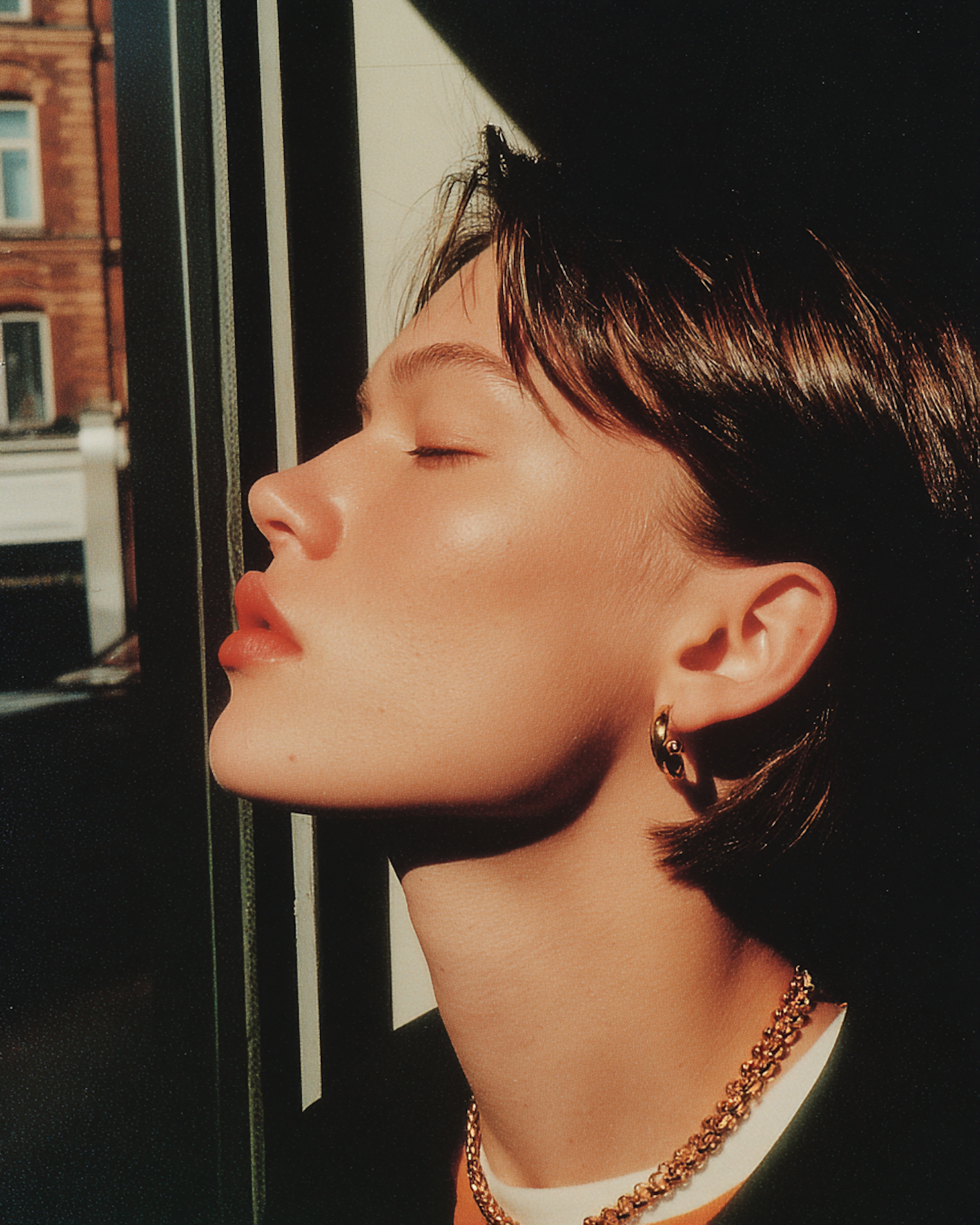 Close-up of a serene individual with short hair, gold jewelry, and warm lighting, creating a peaceful and stylish urban vibe.