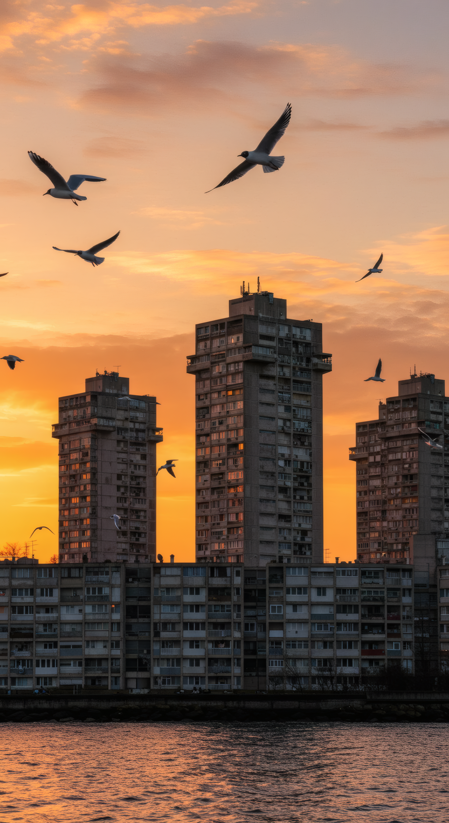 Seagulls soar over urban high-rises at sunset, with vibrant orange skies reflecting on calm waters below.