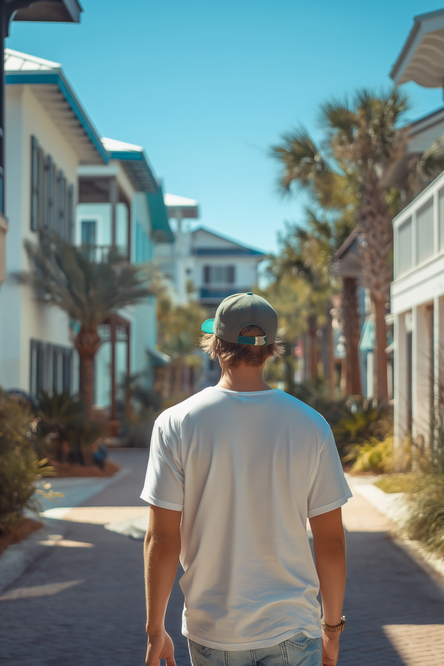 Young man in white t-shirt and cap walks down a sunny street lined with palm trees and modern buildings.