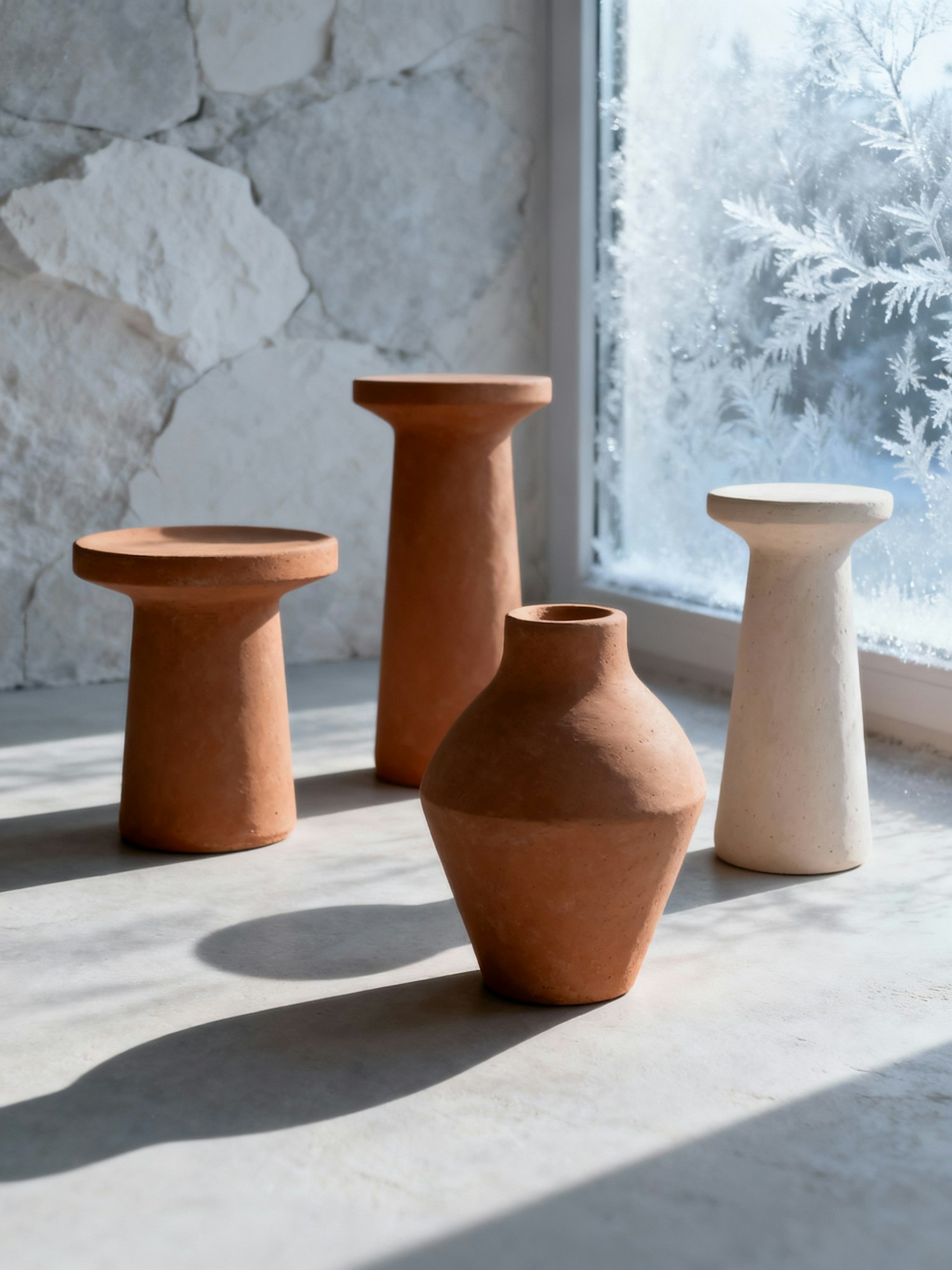 A minimalist arrangement of terracotta and ceramic vases near a frosted window, with sunlight casting soft shadows on a smooth surface.