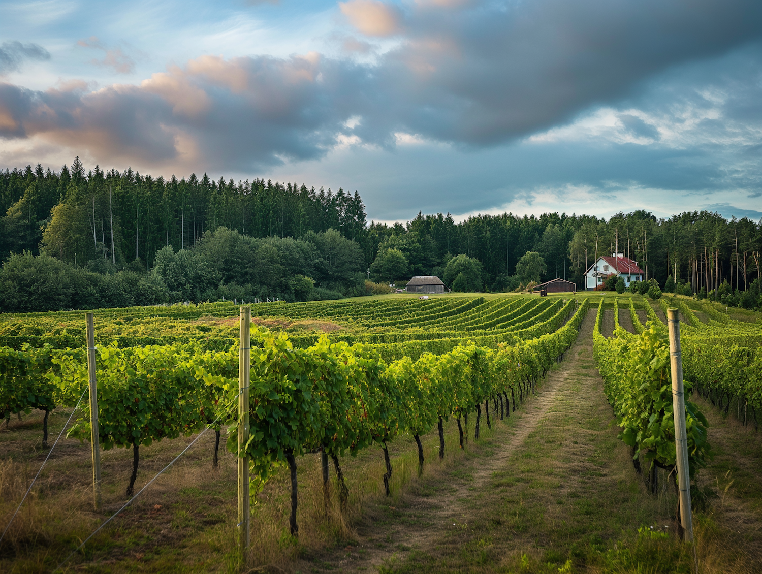 Lush vineyard with green grapevines, bordered by a forest and a quaint white house with a red roof under a partly cloudy sky.