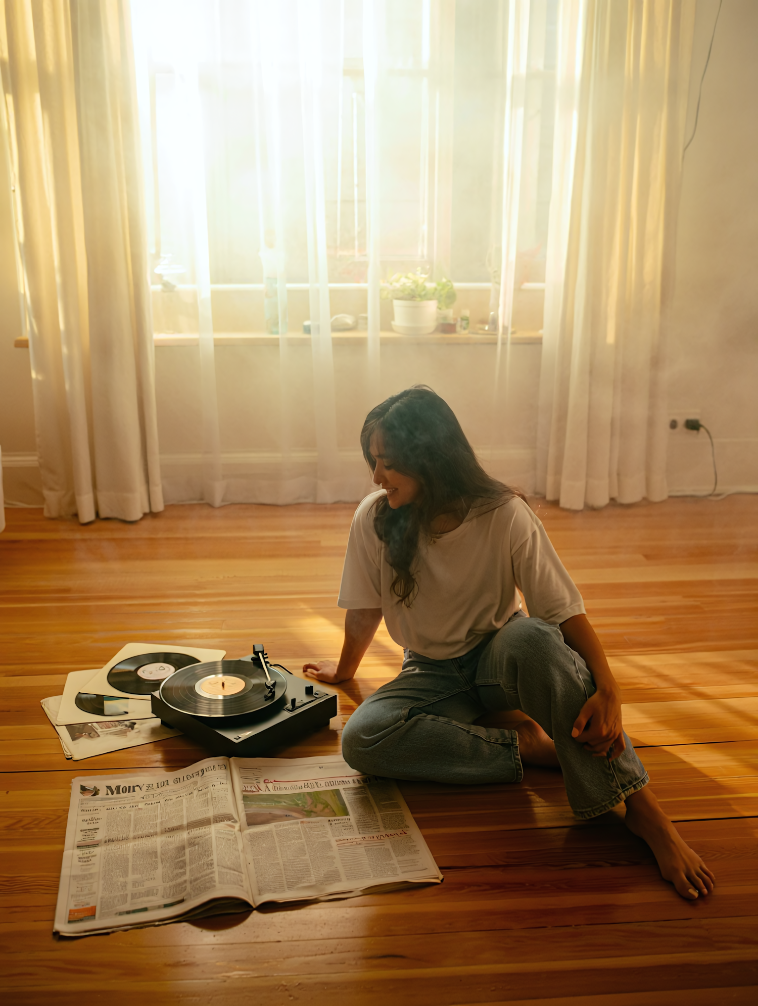 A serene scene of a woman enjoying music on a record player, surrounded by sunlight streaming through sheer curtains in a cozy room.