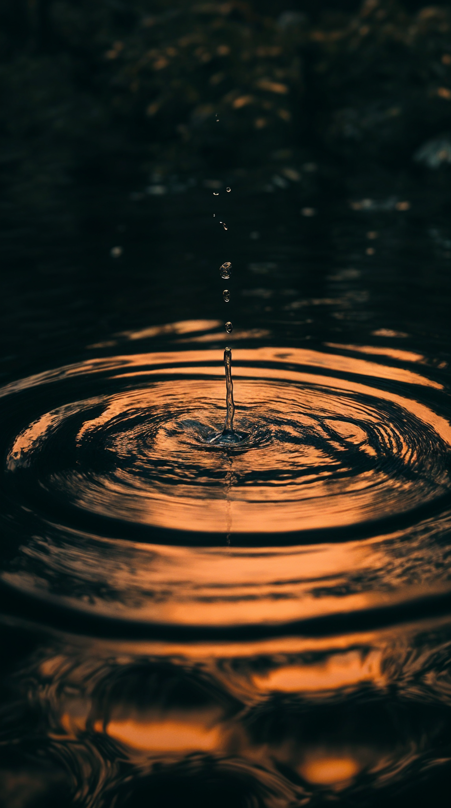 Golden water droplet creates ripples in a serene, dark setting, reflecting warm sunset hues.