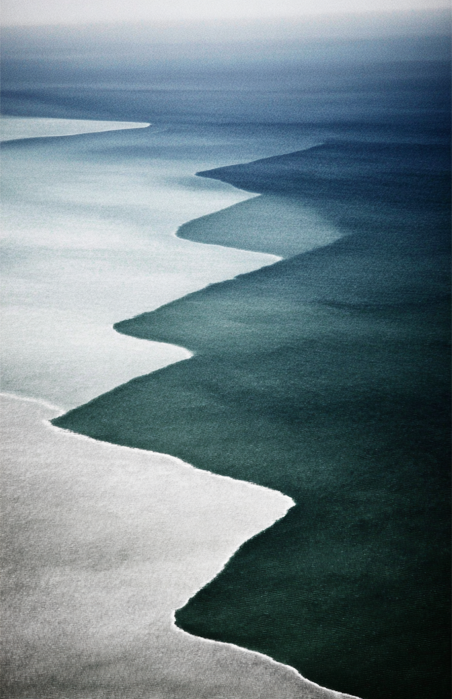 A stunning abstract view of water with contrasting shades of blue and green, creating a natural zigzag boundary and serene atmosphere.