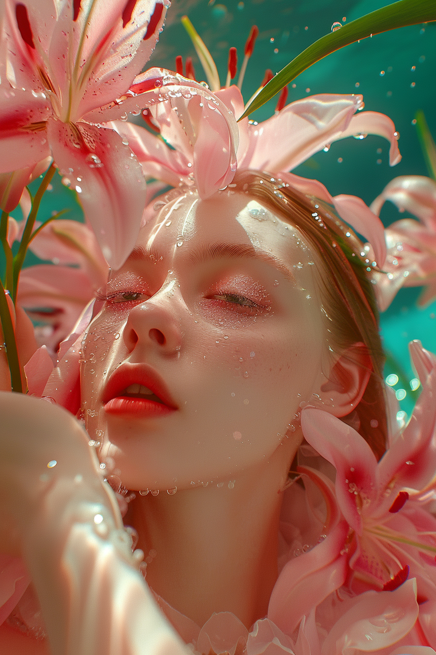 Ethereal underwater portrait of a woman surrounded by pink lilies, creating a dreamy and serene atmosphere.