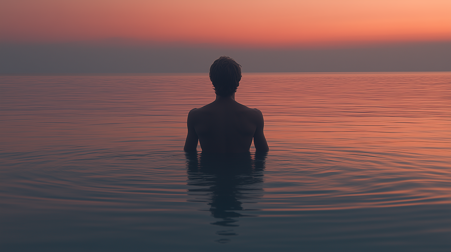 Silhouette of a person in calm water at sunset, with vibrant orange and pink hues reflecting on the surface.