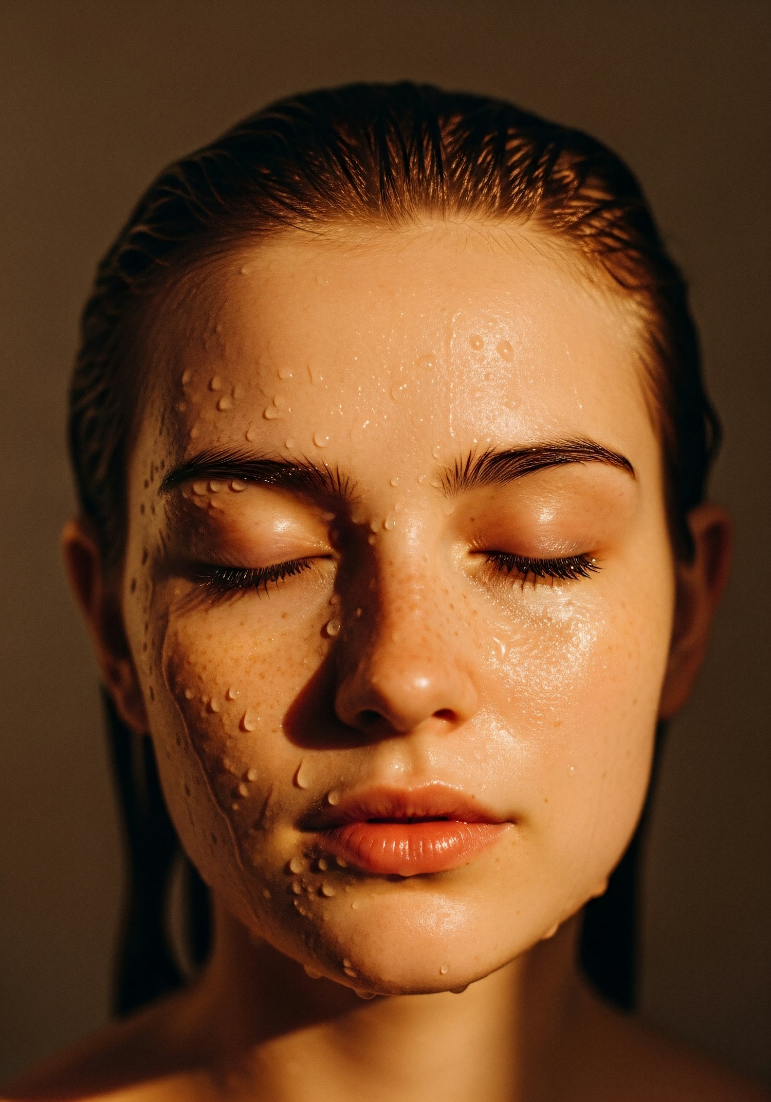 Close-up of a serene face with water droplets, warm lighting highlighting skin texture, evoking calm and natural beauty.
