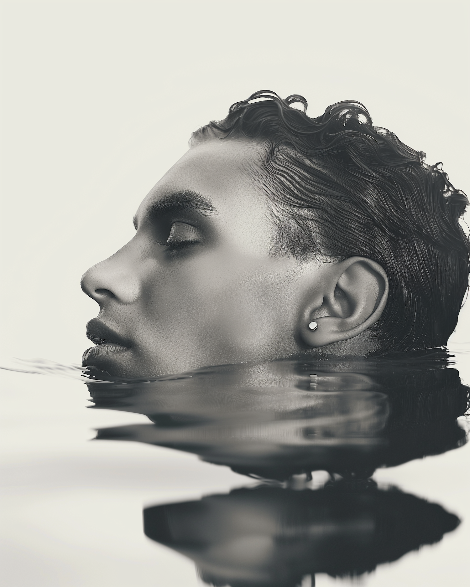 Artistic black-and-white portrait of a serene face partially submerged in water, with slicked-back hair and a reflective surface.