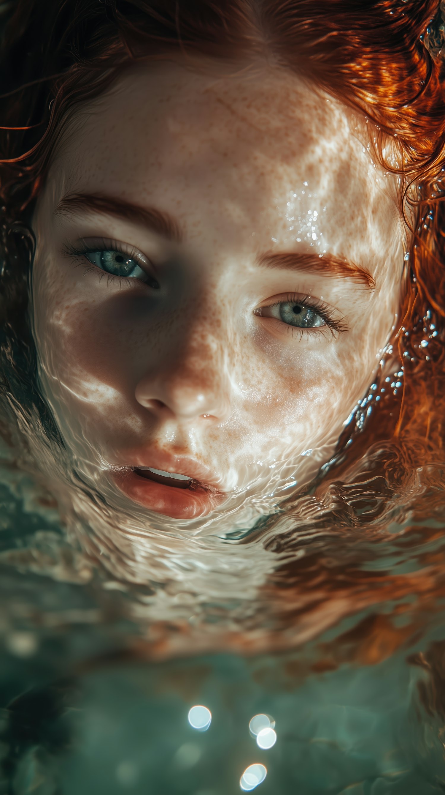 Close-up of a freckled girl with red hair and blue eyes, partially submerged in water, creating a serene and ethereal atmosphere.