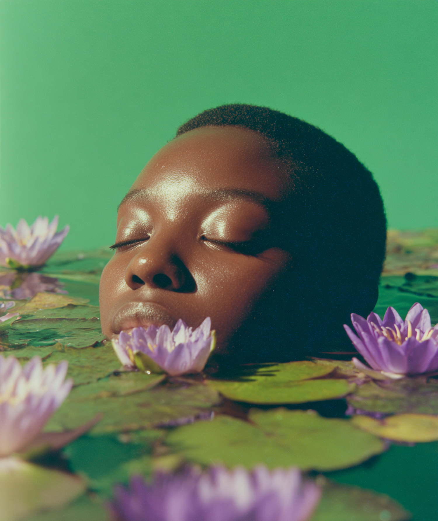 A serene portrait with a person partially submerged in vibrant water with purple lilies under a bright green background.