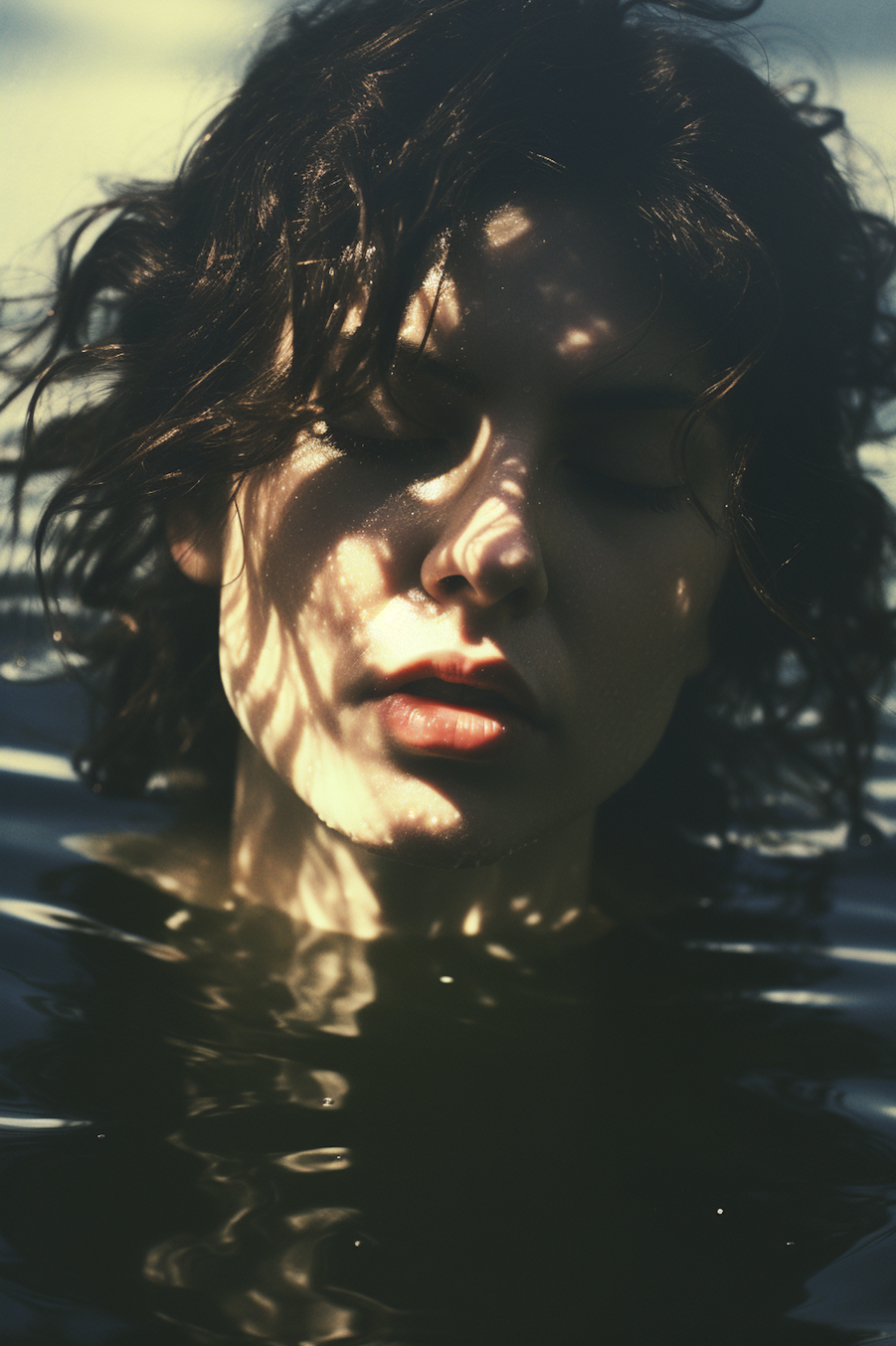 Serene portrait of a woman with closed eyes, submerged in water, with sunlight casting leaf shadows on her face.