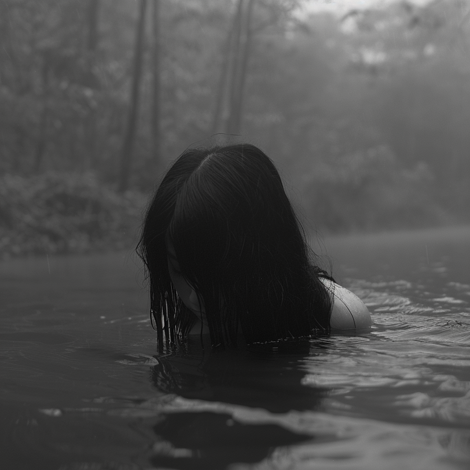 Monochromatic image of a person with wet hair in misty water, surrounded by blurred trees, evoking a mysterious and somber mood.