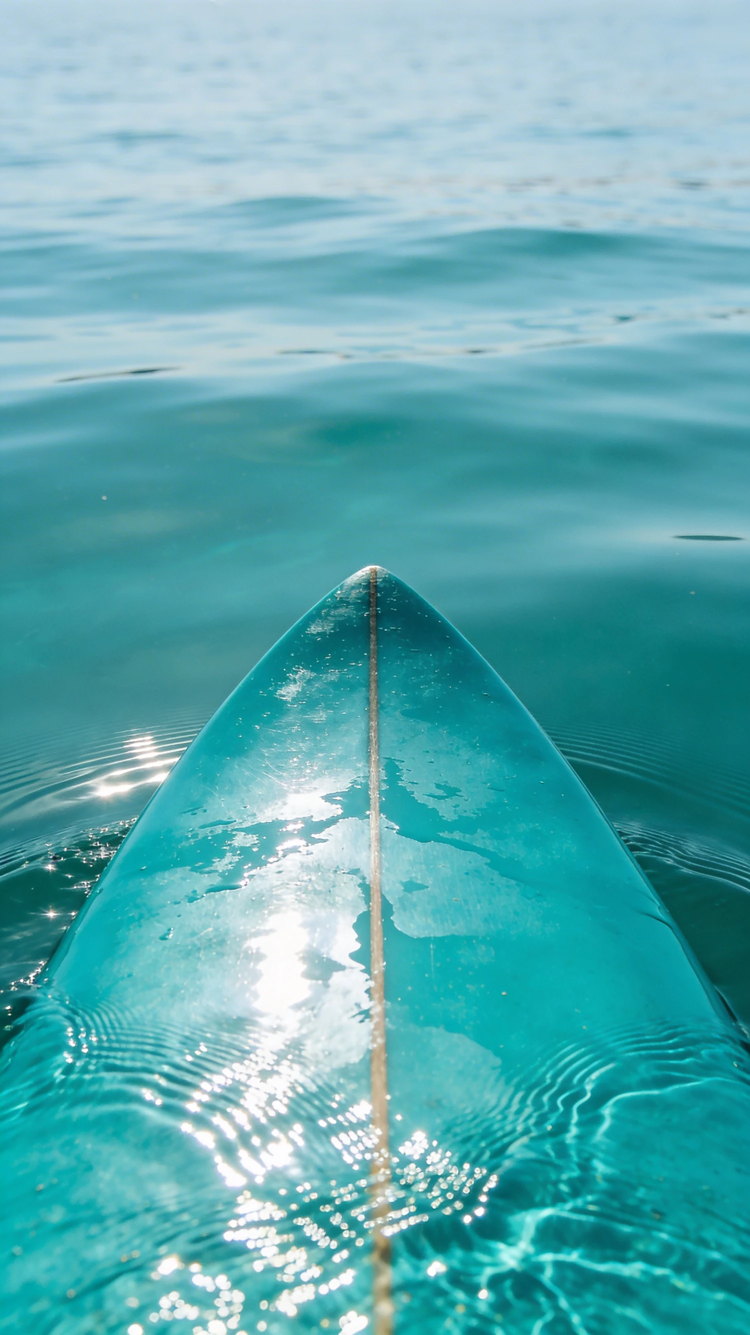 A close-up of a surfboard tip on calm turquoise water, reflecting sunlight and creating a serene, peaceful atmosphere.