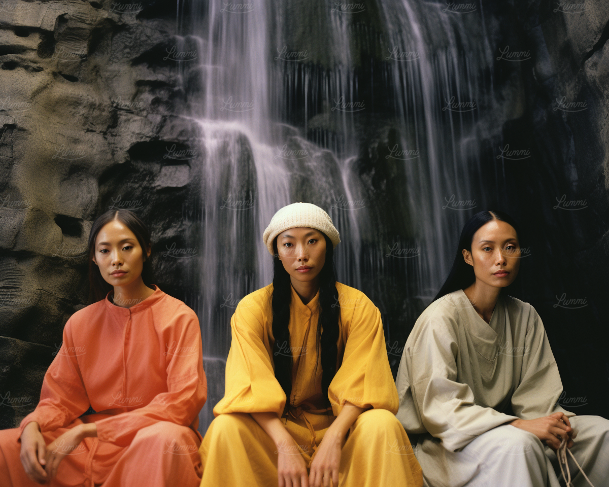 Three women in colorful outfits sit serenely in front of a waterfall, exuding harmony and tranquility.