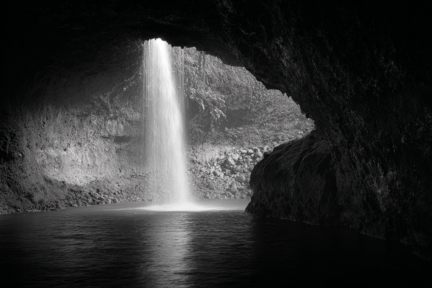 A stunning black-and-white photo of a waterfall inside a cave, with light streaming through and reflecting on the water below.